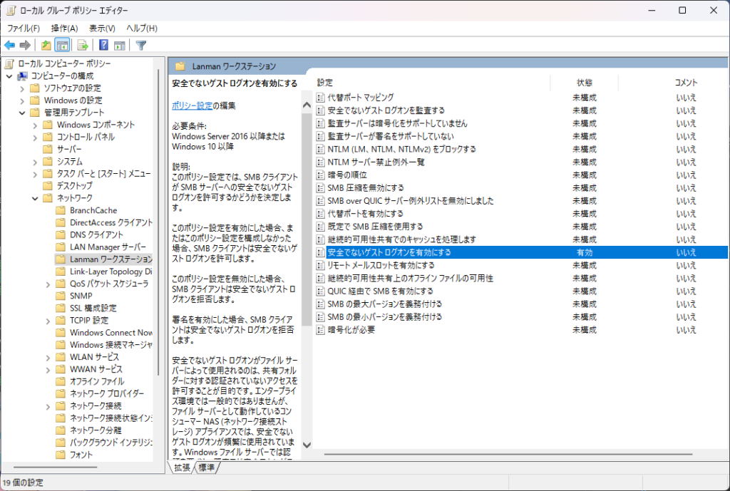 Windows11からsambaに接続する時に、ローカルグループポリシーの設定が必要だったので覚え書き。